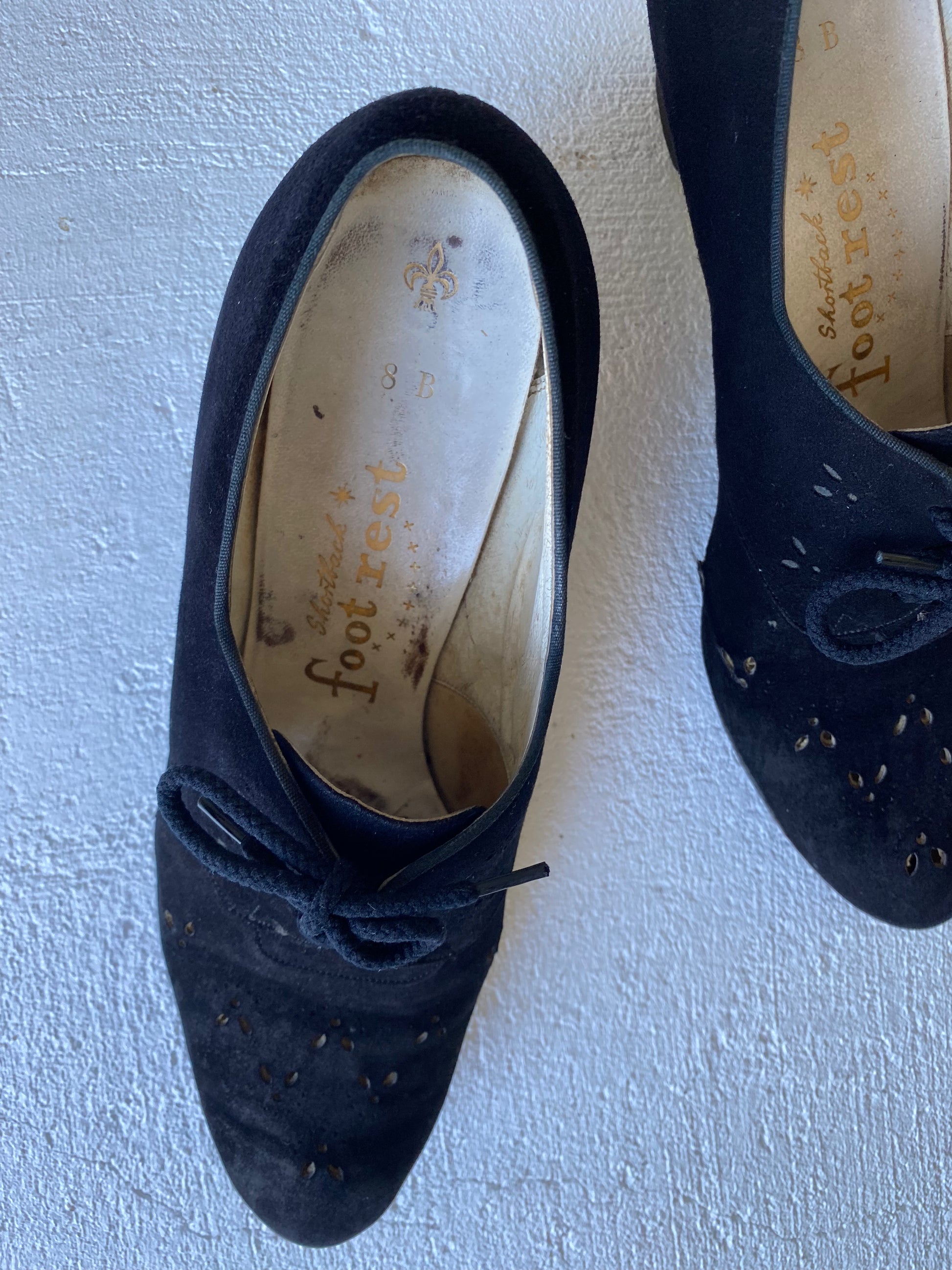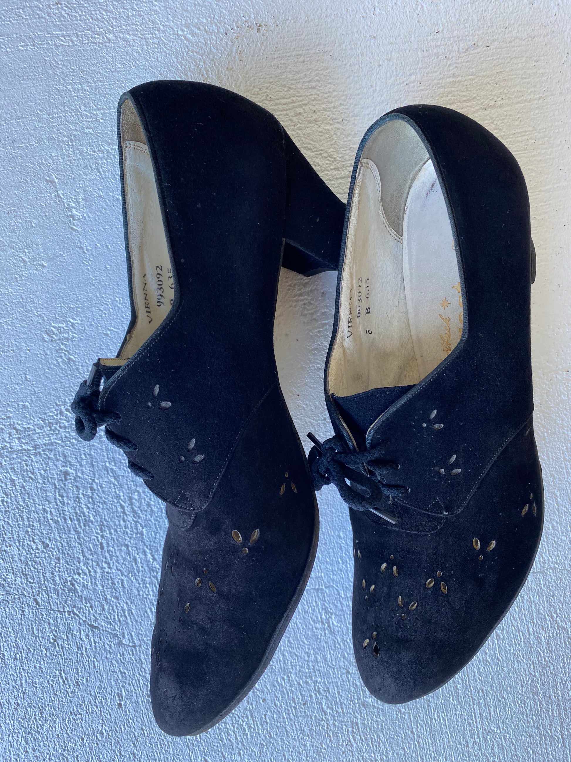 In good condition a beautiful pair of black suede heeled 40's lace up shoes with lovely perforated detailing. Some ware consistent with age.