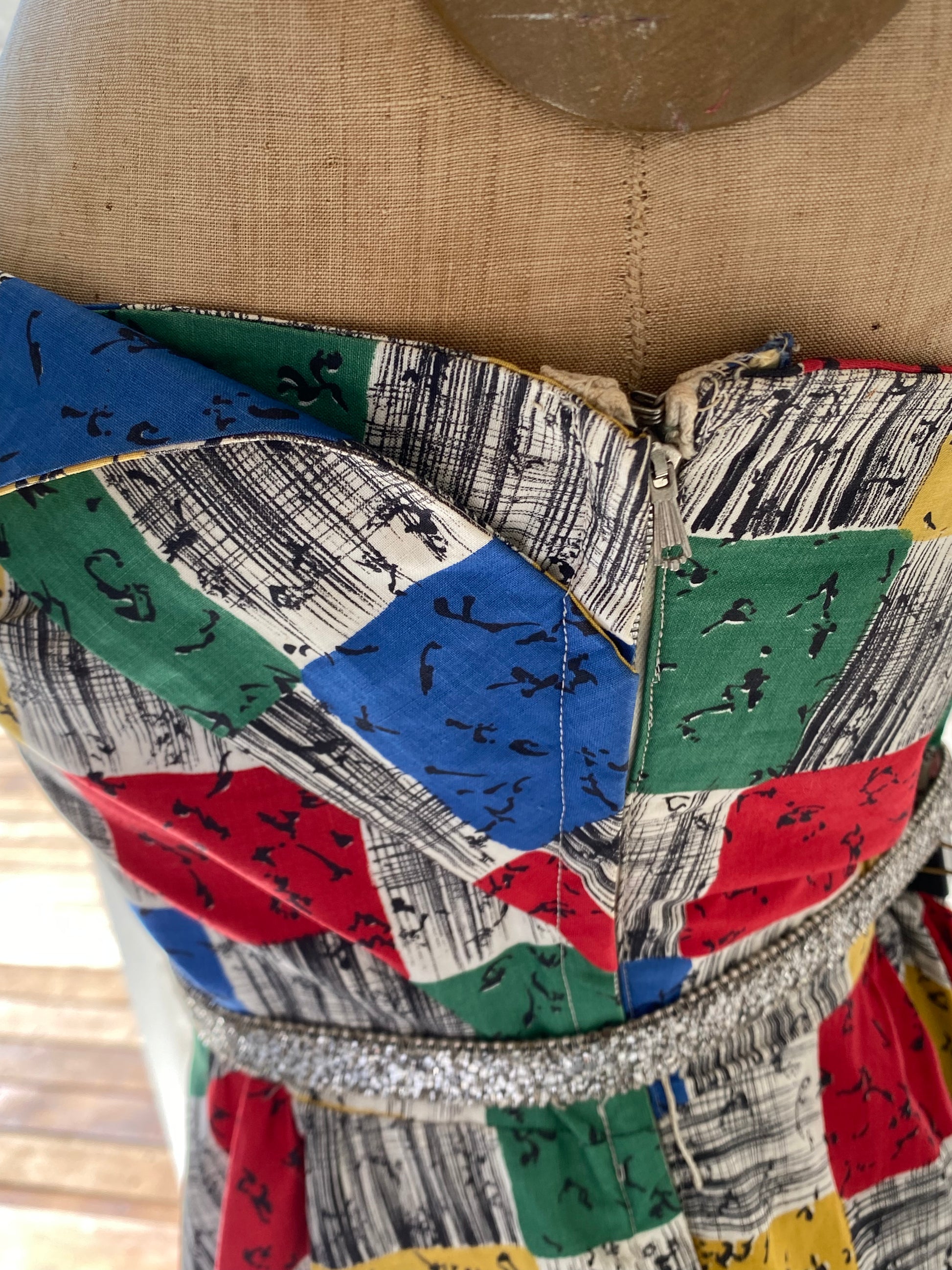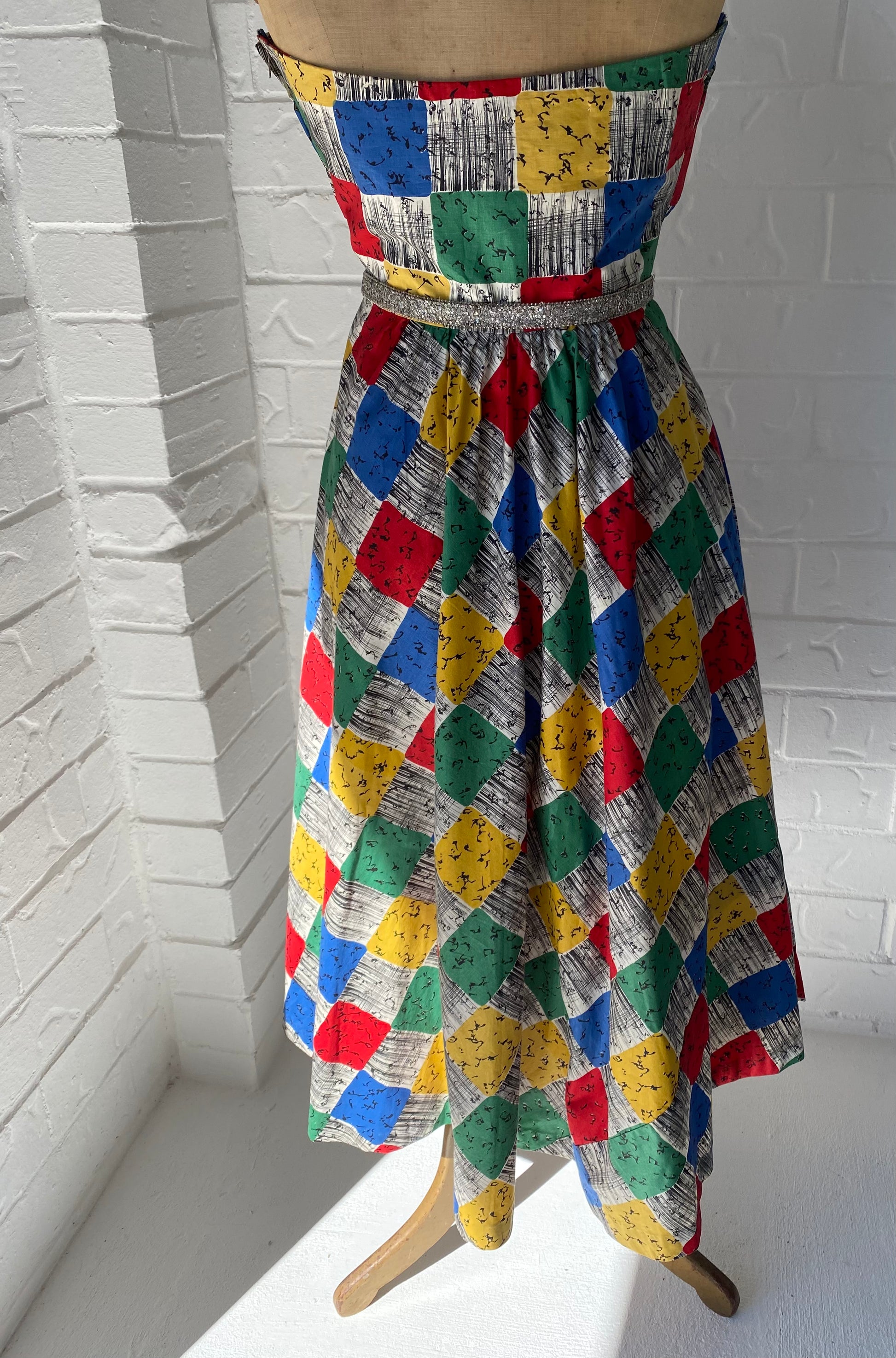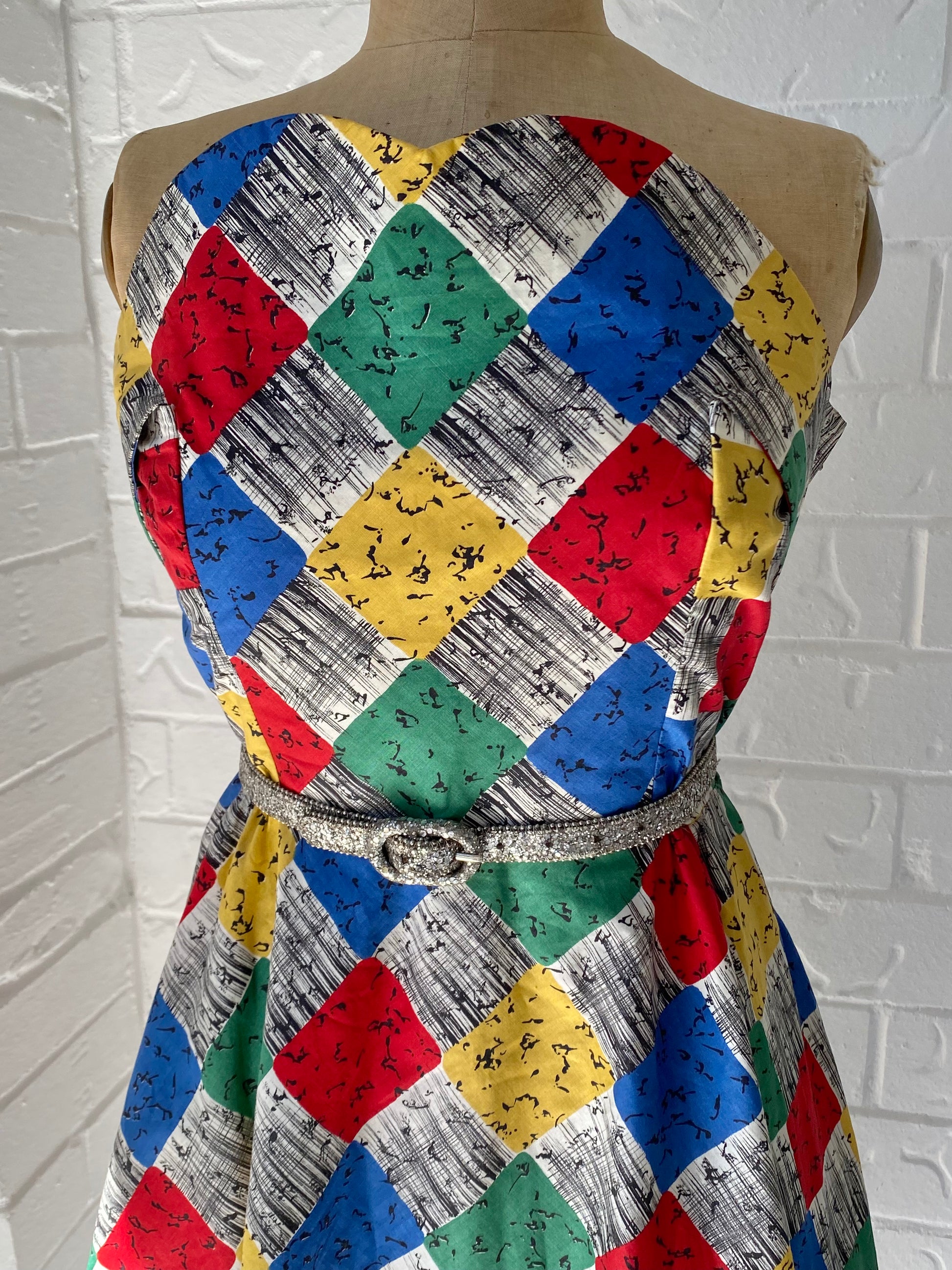 Stunning 1950's home couture, pure cotton, colourful check, black and white graphic fabric, strapless, side zip closure dress. Small discolouration in one square as shown in photos, overall good condition. Currently a size 14 and perfect for alteration if smaller sizing required.