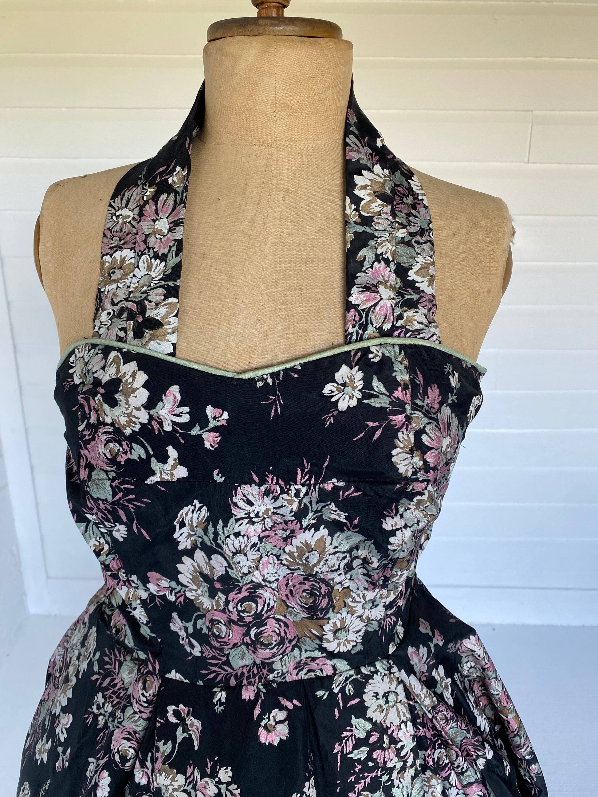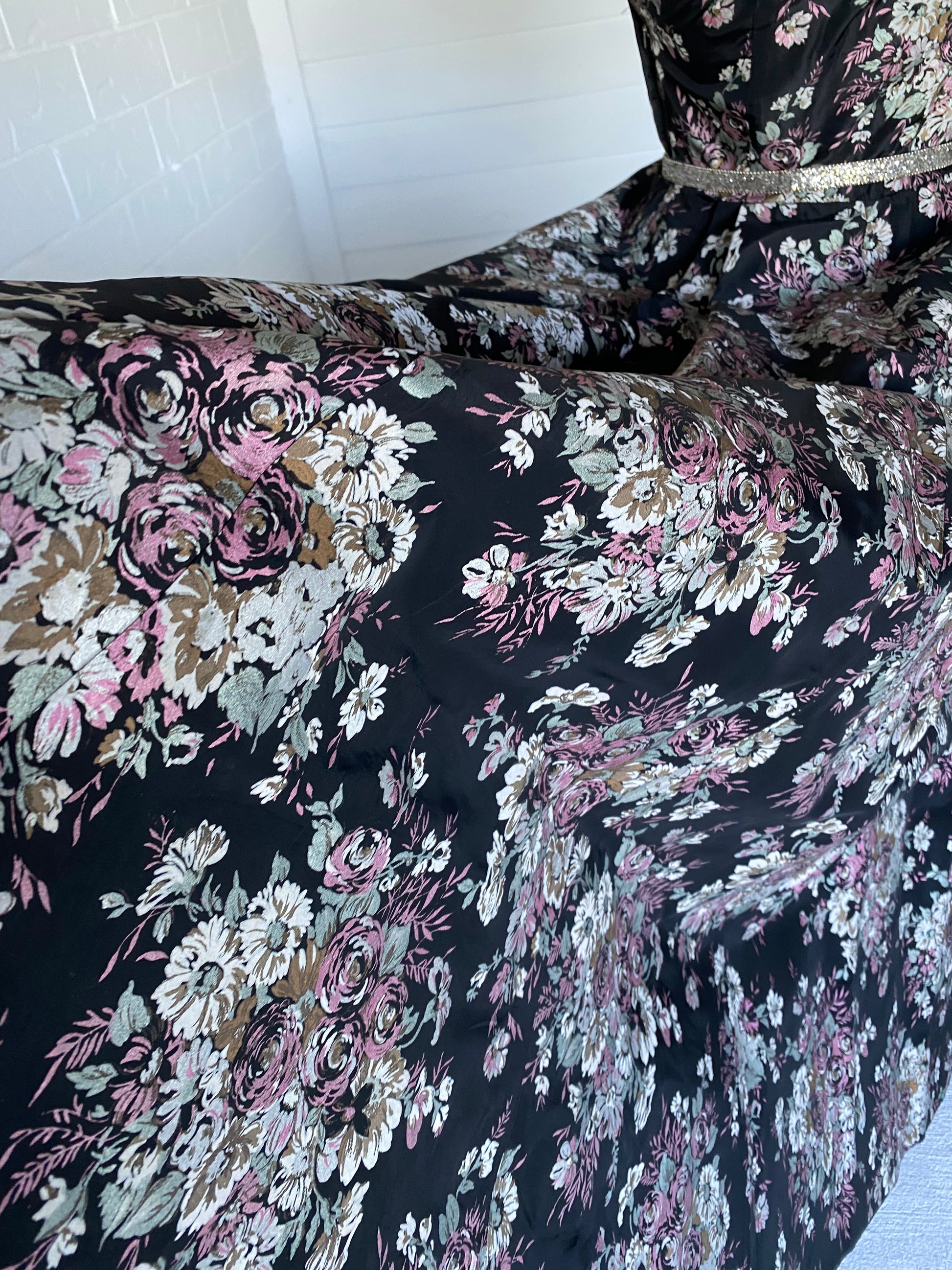 This is a stunning hand printed with metallic paint, Japanese style flowers on a very stiff fine taffeta with a lovely crunch sound when handled, label reads A Wendy Dress,