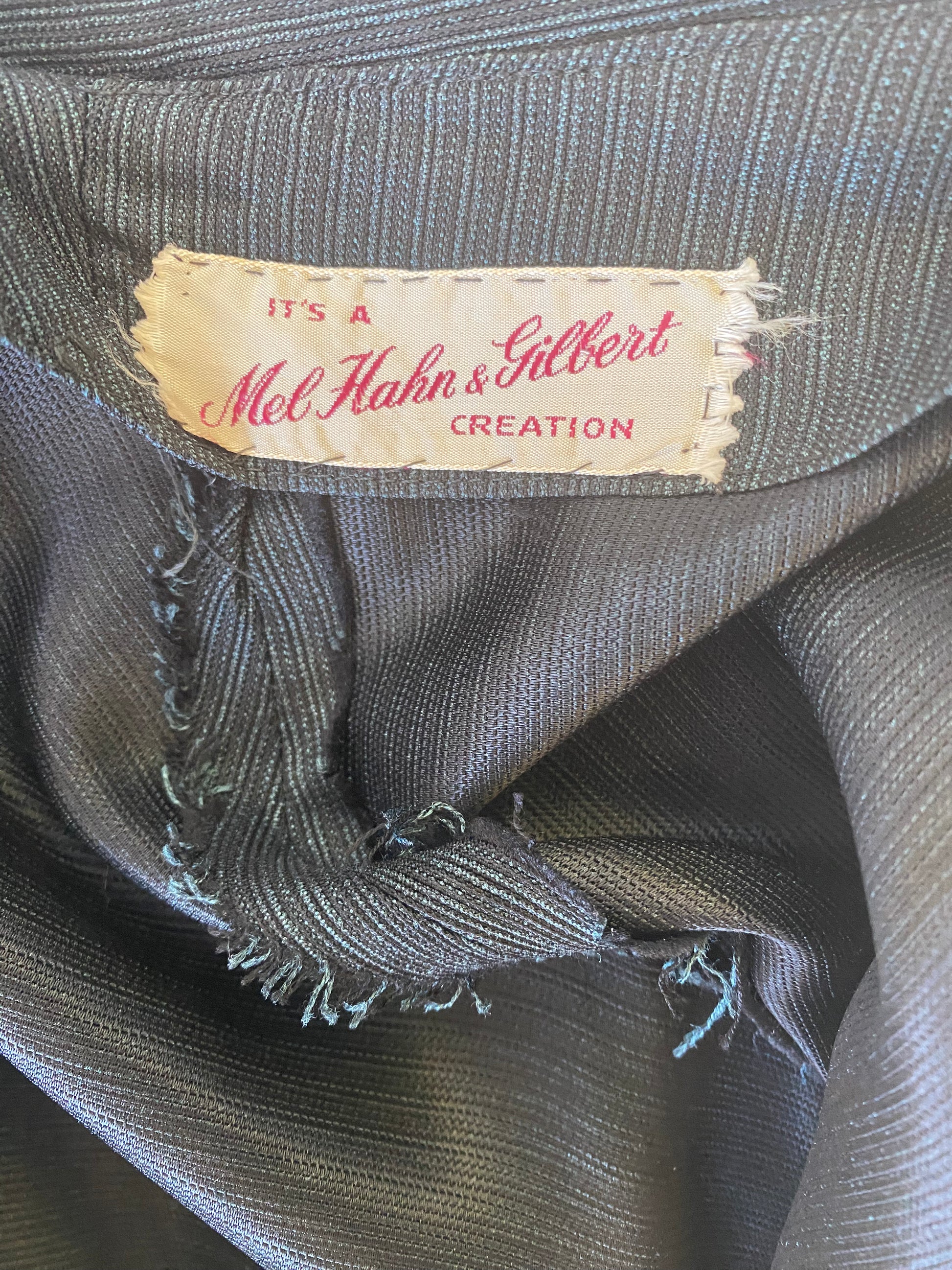 This is a superbly constructed dress made from a woven grosgrain fabric in midnight blue/ green colours. Heavy, solid silver plate buttons running the full length. Fabulous, cut out neckline and classic Raglan sleeves. This dress is extremely flattering and comfortable on and exudes quality. There are some small areas of wear commensurate with age. Original label, It's a Mel Hahn & Gilbert Creation.