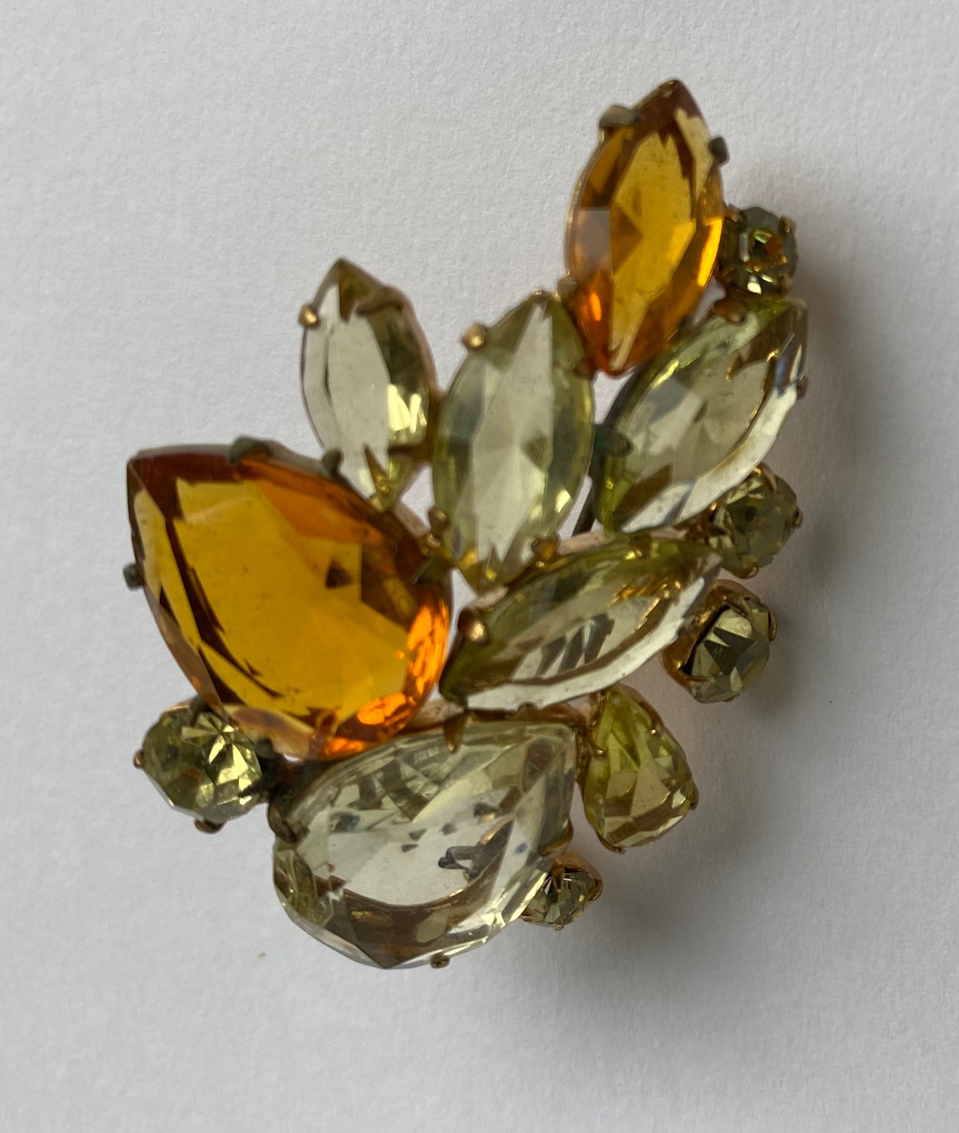 Beautiful quality, 1950s cut glass in amber and citrine colours set in a gold plate claw setting. Excellent condition, most likely European, when costume jewellery was made to the quality of fine jewellery. A truly collectable, timeless, wearable piece.